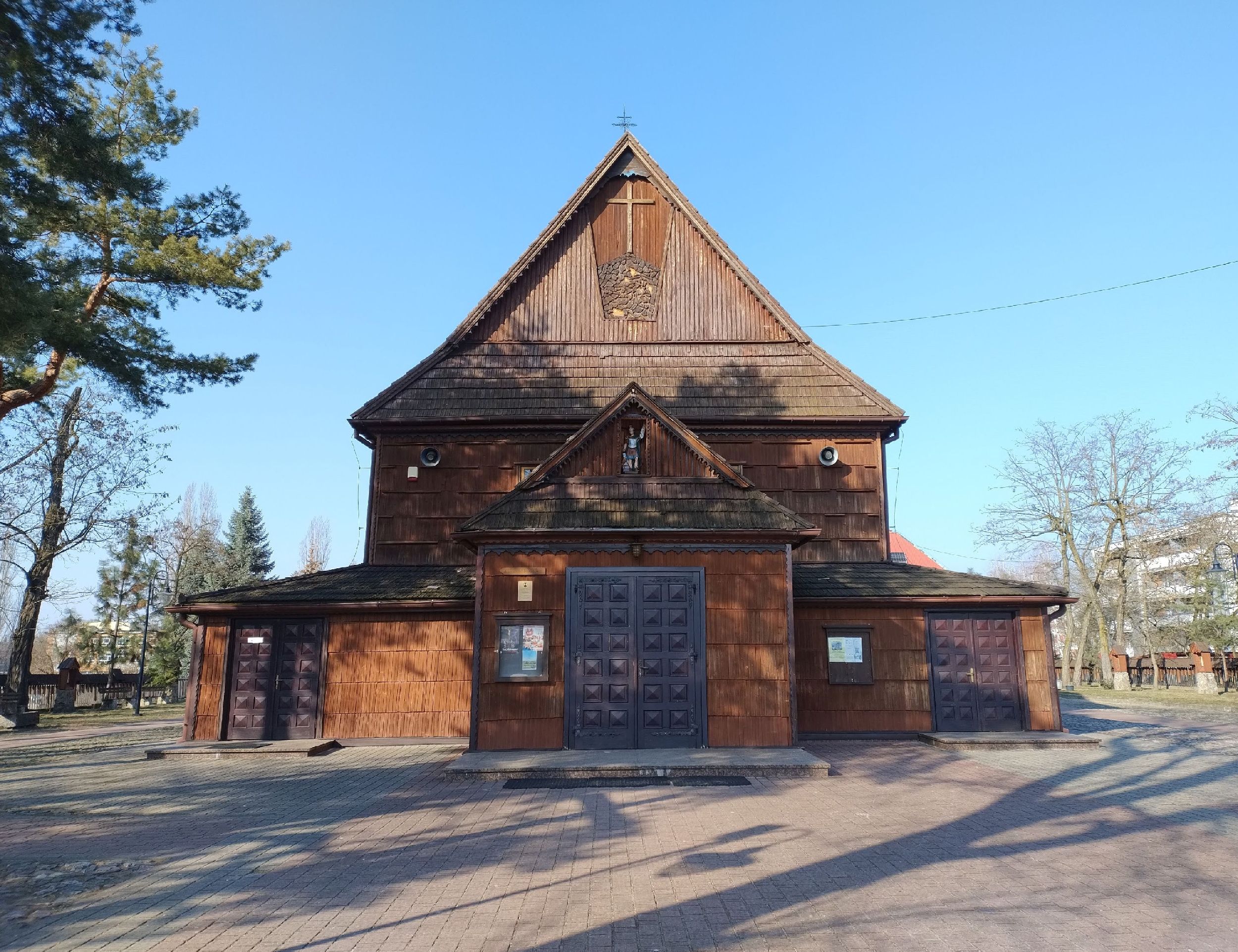 Drewniany kościół św. Floriana jest jednym z tych zabytków, które zaskakują już samą obecnością w mieście kojarzonym z hutą, stalą i żelbetem. Świątynia, wzniesiona w 1802 roku, reprezentuje tradycyjną drewnianą architekturę sakralną regionu i w zestawieniu z późniejszą zabudową tworzy mocny kontrast, przypominając czasy, gdy okoliczne wsie żyły zupełnie innym rytmem. Z daleka widać charakterystyczną sylwetkę kościoła z mocno nachylonym dachem i szalowanymi ścianami, a obok – osobno stojącą, również drewnianą dzwonnicę, która dopełnia całość kompozycji. Wnętrze zaskakuje przytulnością: drewniane ściany, chór muzyczny wsparty na słupach, prospekt organowy i ołtarze z XIX wieku tworzą atmosferę prostoty i skupienia, jakiej nie ma w większych, murowanych świątyniach. Wchodząc do środka, od razu czuć charakterystyczny zapach starego drewna i wosku, a światło wpadające przez niewielkie okna rysuje na ścianach miękkie, ciepłe plamy. Ten kościół pełnił ważną rolę w życiu miejscowej społeczności jeszcze zanim rozrosła się Stalowa Wola, a później stał się jednym z symboli ciągłości między dawnym krajobrazem wsi a nowym, przemysłowym miastem. Dziś, stojąc między nowszą zabudową, robi wrażenie kapsuły czasu – zachowuje pamięć o dawnej parafii, o zwyczajach religijnych i o tym, jak wyglądało życie przed rewolucją COP‑u. Wizyta w tym miejscu świetnie uzupełnia oglądanie nowoczesnych kościołów i architektury Stalowej Woli, pozwalając zobaczyć, z jakiego świata wyrasta współczesne miasto.